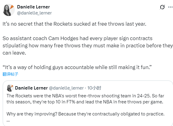 火箭随队记者Danielle Lerner报道,每位火箭球员本赛季都签署了与训练挂钩的罚球协议,协议条款会根据个人训练计划和目标量身定制,杜兰特承诺每次训练罚进20球。