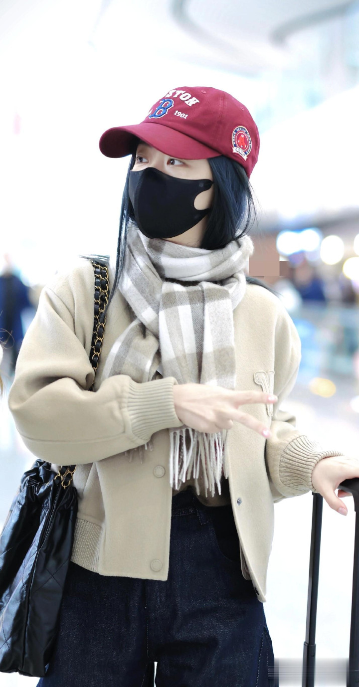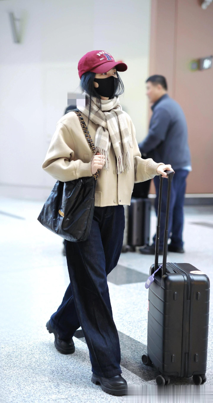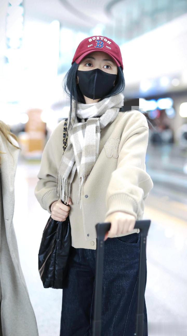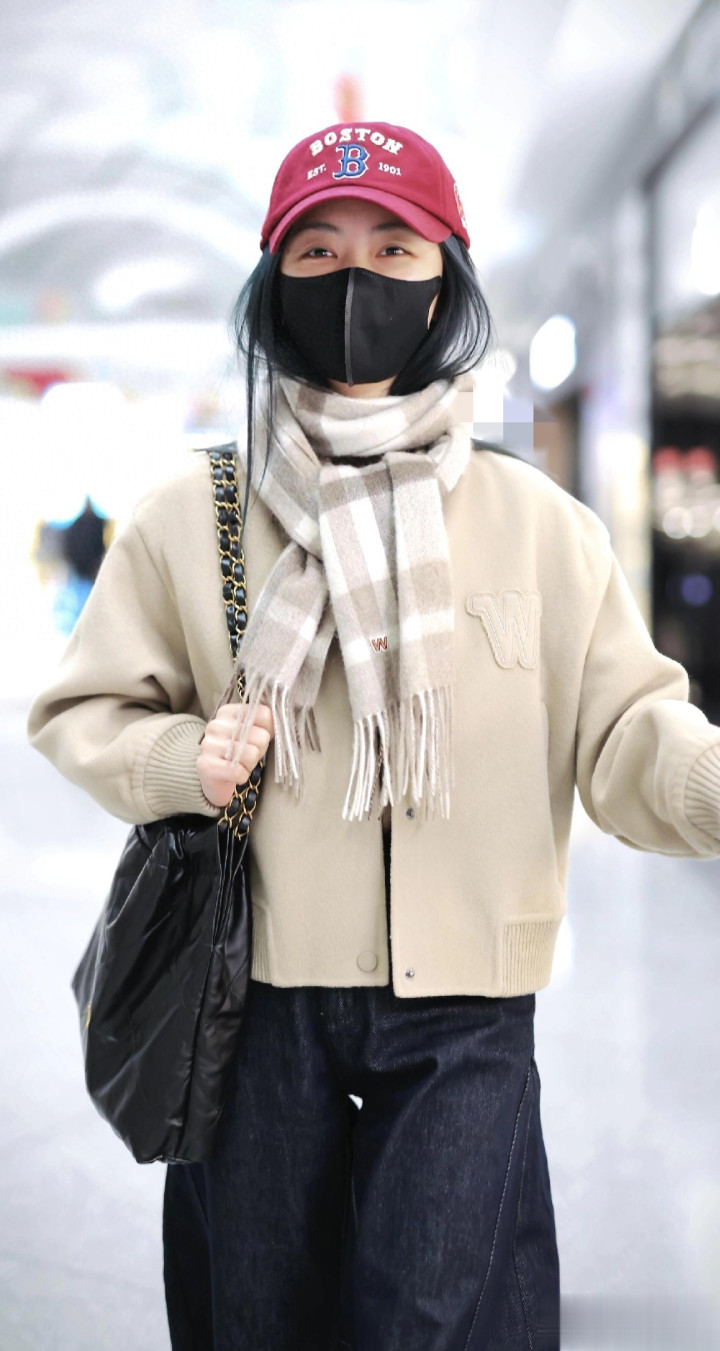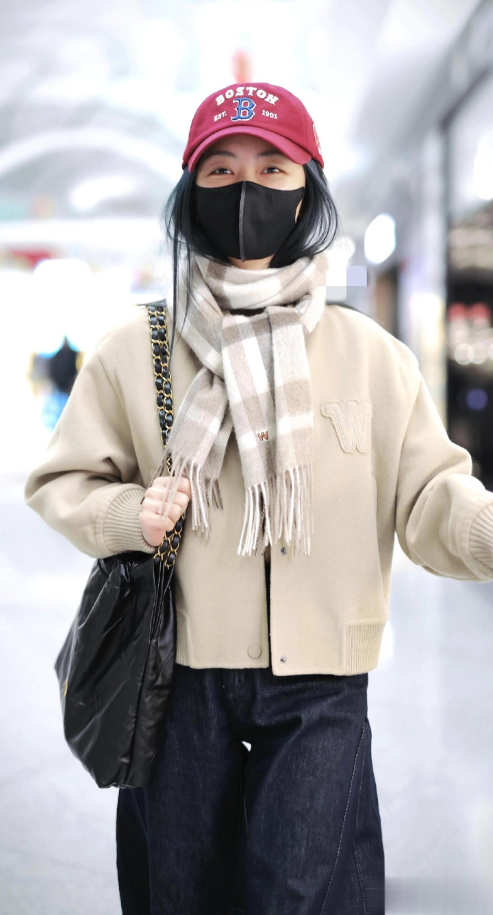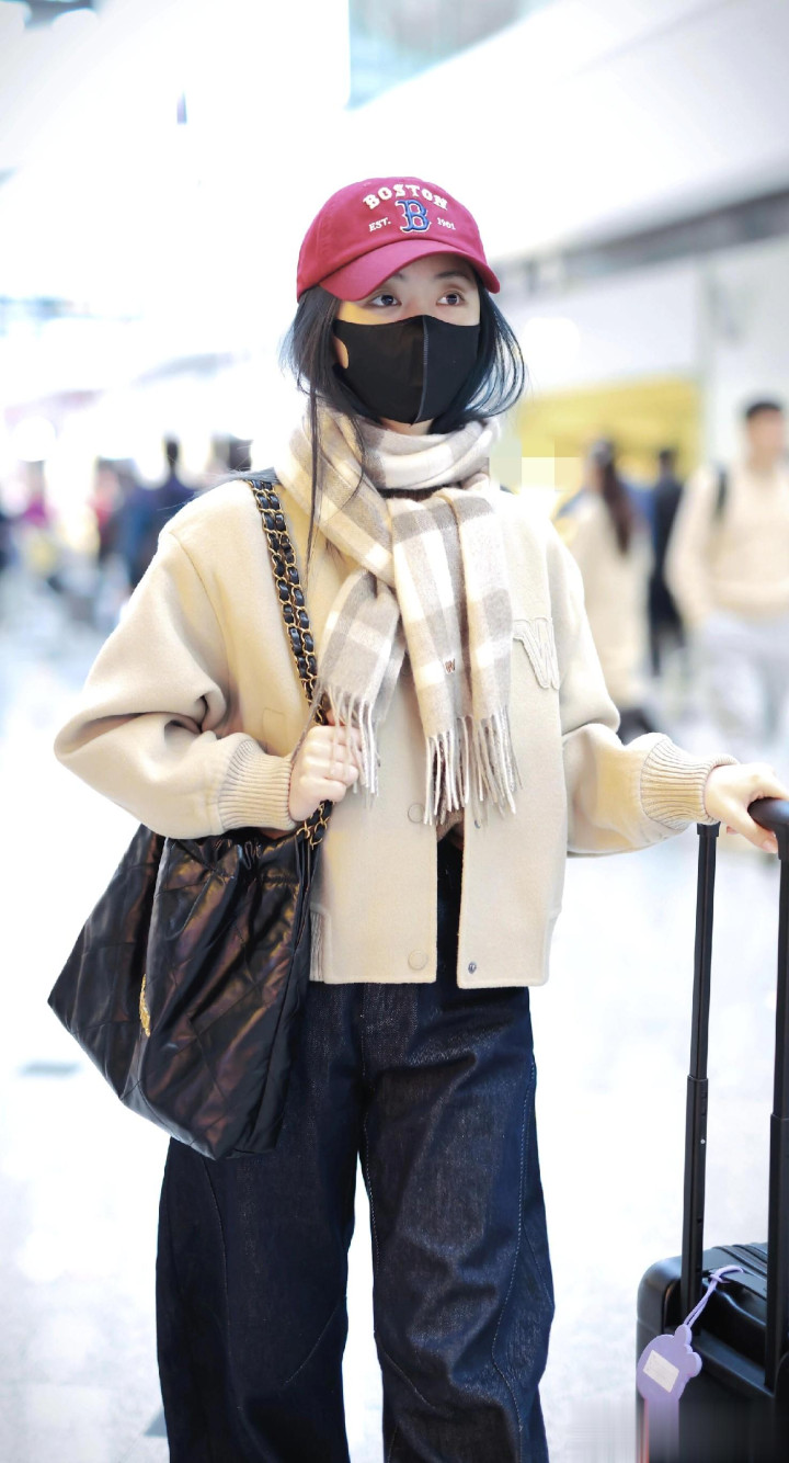 > 谭松韵最新高清机场路透照, 穿米色外套搭配格子围巾, 甜妹氛围感