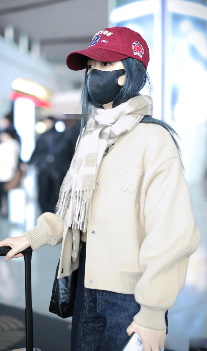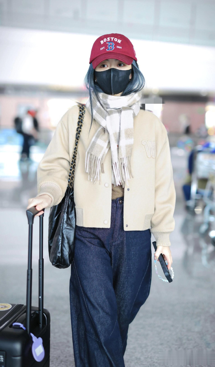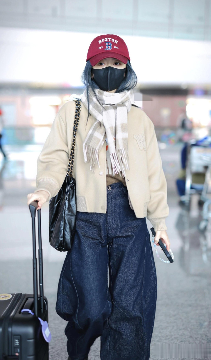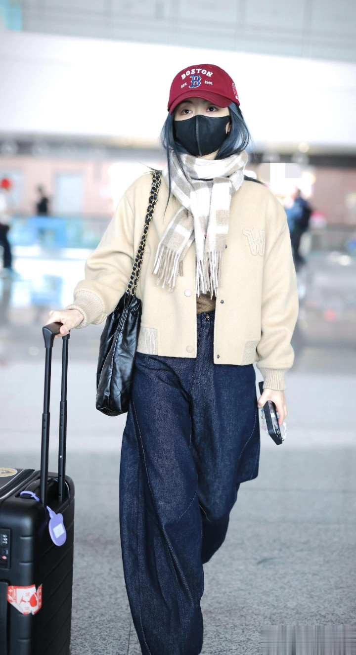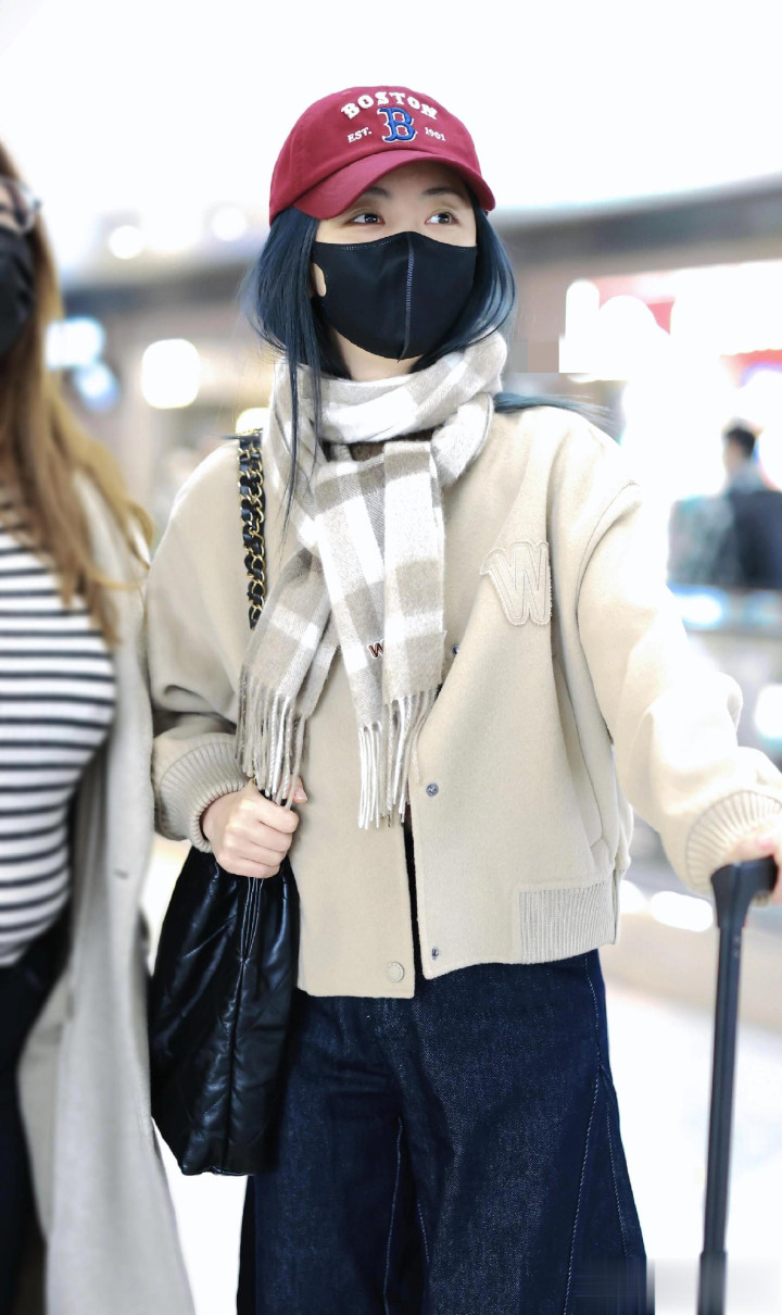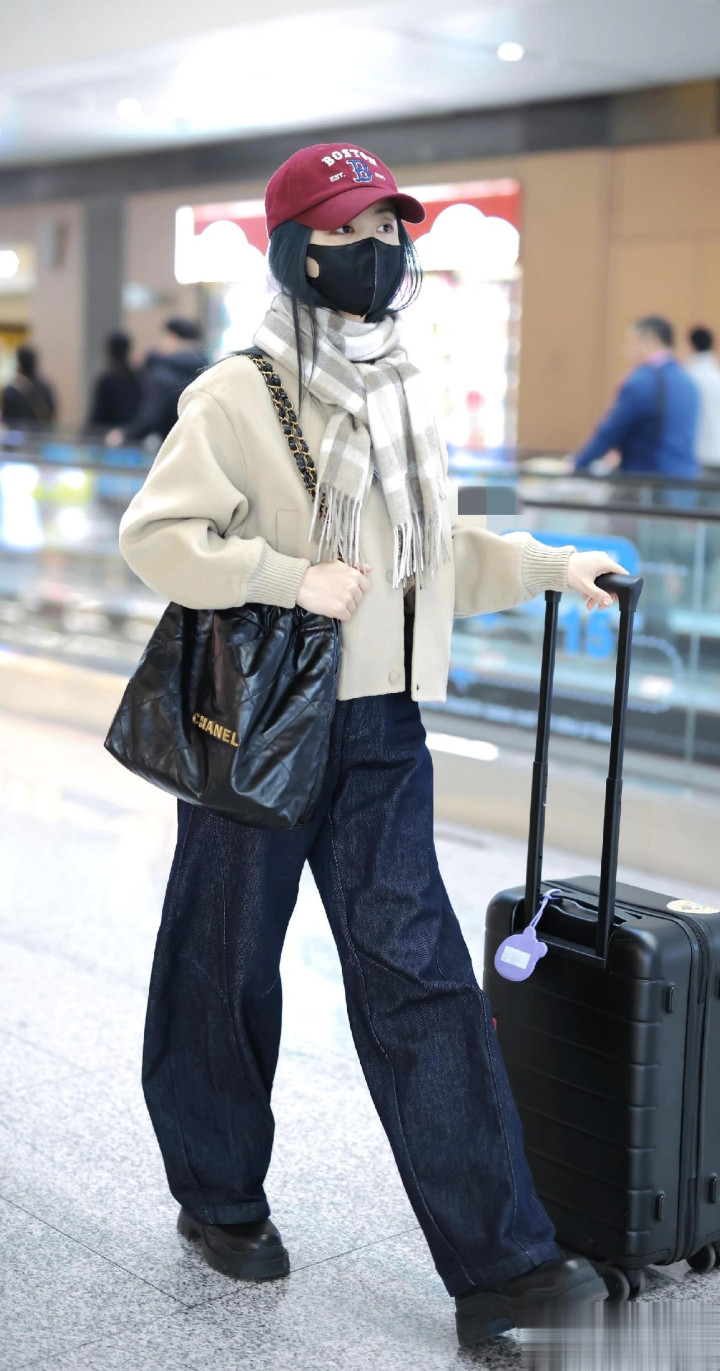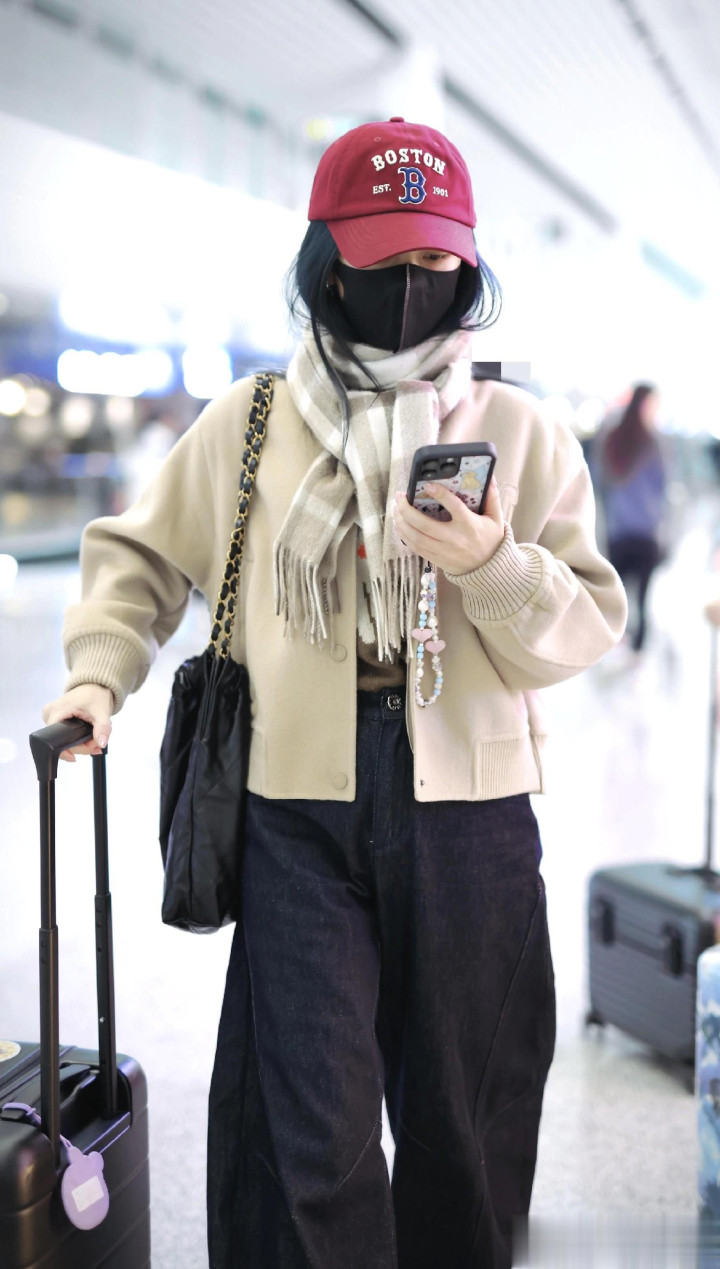 > 谭松韵最新高清机场路透照, 穿米色外套搭配格子围巾, 甜妹氛围感