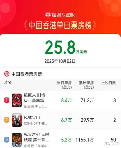 据国内的电影平台显示,《风林火山》在中国香港两天时间,仅收获了不到30万美元票房,换算成人民币差不多是300万。都不如已经上映有一周多的日本动画电影《链锯人 剧场版》,如此不得不说,香港电影已经被抛弃了,且不仅仅只是被中国内地所抛弃。
