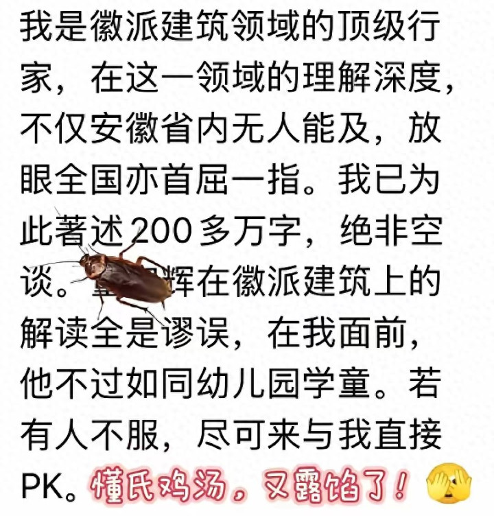 据这位“徽派建筑领域的顶级行家”自夸称“他对安徽徽派建筑的理解深度,不仅安徽省内无人能及,放眼全国也是首屈一指,因为他对徽派建筑的著作就已经有200多万字,而且都不是空谈的内容”。