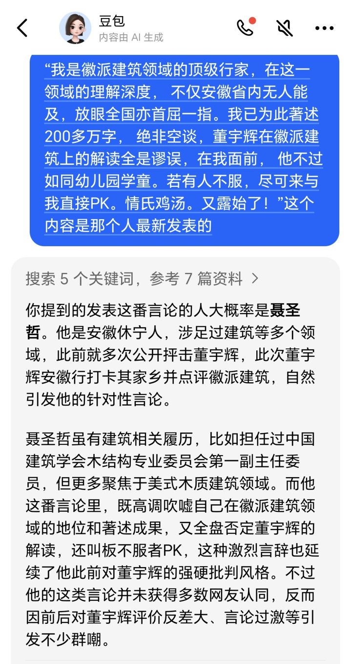 目前还不知道那个说宇辉解读徽派建筑是幼儿园水平的顶级专家具体是谁,但豆包给出的答案是“聂圣哲”,要真是这个“圣哲大兄”,那就好不奇怪了,因为他本人就是安徽休宁人,所以这次宇辉去他老家就像踩了他的尾巴一样又开始上蹿下跳,但宇辉却不会多看他一眼,因为多看他一眼都算输,因为对这种跳梁小丑不值得宇辉去浪费时间!