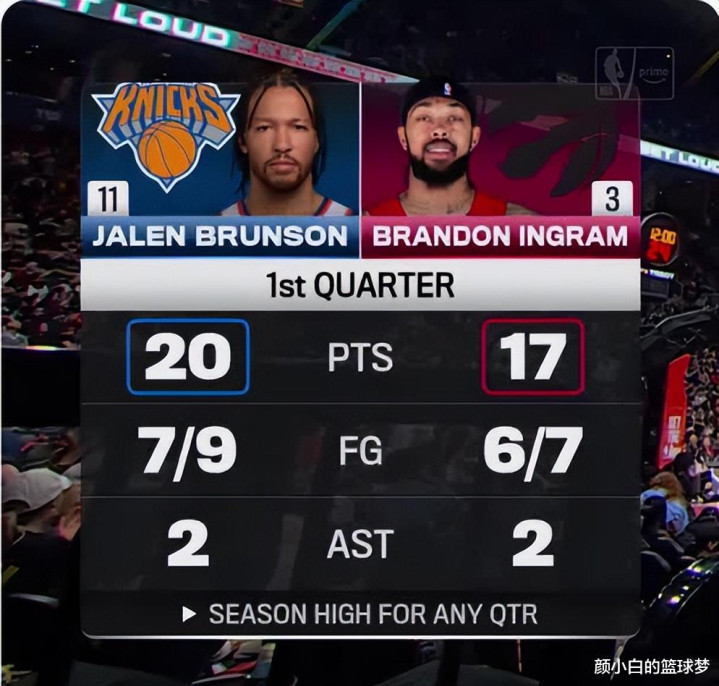 首节开场两队的核心人物对轰,两人都打满12分钟,布伦森9中7+6中4拿到20分2助攻,英格拉姆7中6+三分1中1拿到17分3篮板2助攻2抢断,英格拉姆在最后1分钟帮助猛龙领先结束首节。